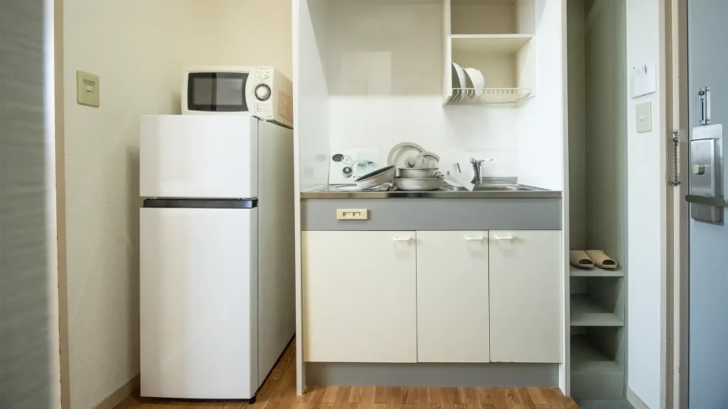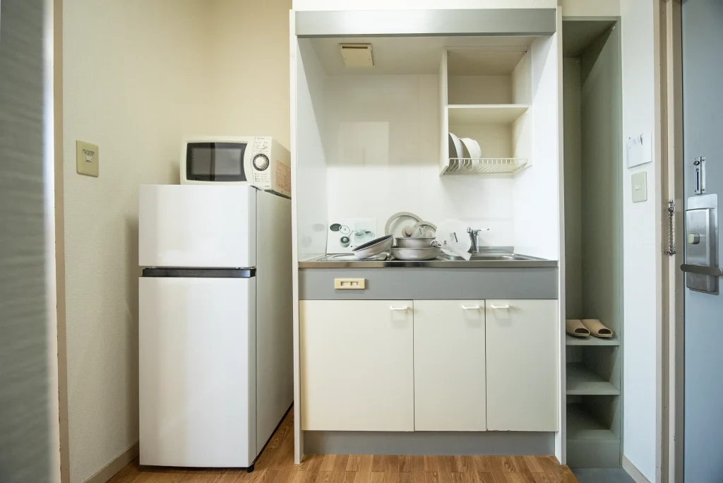 調理台、電子レンジ、冷蔵庫を備えたコンパクトキッチンを完備しております。ご自宅で過ごされているような自然で快適なご生活をしていただけます。